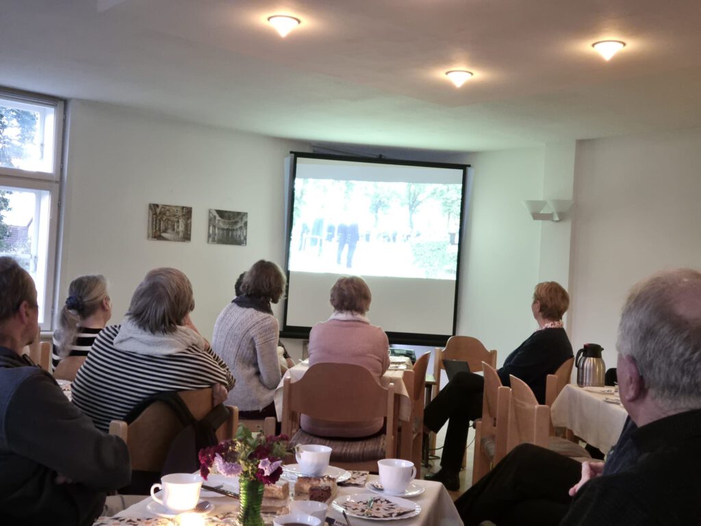 Im Anschluss an die Gedenkfeier versammelten sich die Teilnehmer zu einem gemütlichen Kaffeetrinken im Pfarrhaus. Bei selbst gebackenem Kuchen der Pfarrgemeinde und vom Förderverein gestiftetem Kaffee konnten die Anwesenden den Film „Einweihung der Gedenkplatte für die Opfer und Gefallenen des 2. Weltkrieges“ sehen.