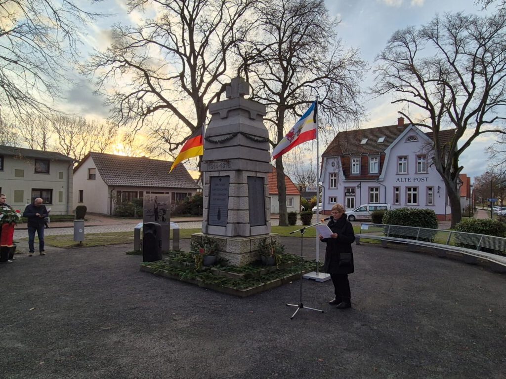 Dagmar Opolski verlas das Totengedenken, während ein Mitglied der Freiwilligen Feuerwehr Parchtitz die Namen der gefallenen und vermissten Kriegsopfer aus Boldevitz nannte. Gerd Bednarski erinnerte eindringlich in seiner Ansprache an das Leid der beiden Weltkriege, bei denen über 80 Millionen Menschen ihr Leben verloren – darunter auch 115 Männer aus dem Kirchspiel Gingst im Ersten Weltkrieg und weitere 105 im Zweiten Weltkrieg.