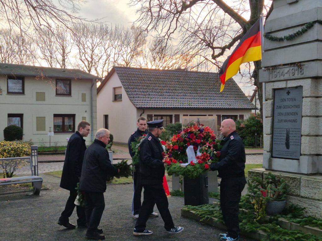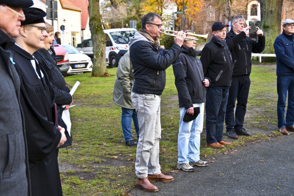 Währenddessen erklang das Trompetenstück „Der gute Kamerad“. Eine Schweigeminute ehrte die Opfer, bevor der Vereinsvorsitzende Jürgen Pahnke allen Unterstützern dankte und die Anwesenden verabschiedete. Den Abschluss bildete das Trompetenstück „Bleib bei mir, Herr“.