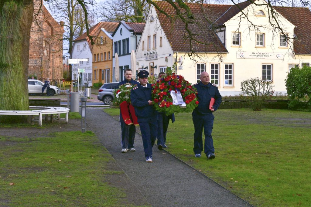 Im Anschluss zog die Gemeinde, angeführt von einer Ehrenformation der Freiwilligen Feuerwehr Gingst und Parchtitz zum Kriegerdenkmal auf dem Marktplatz.